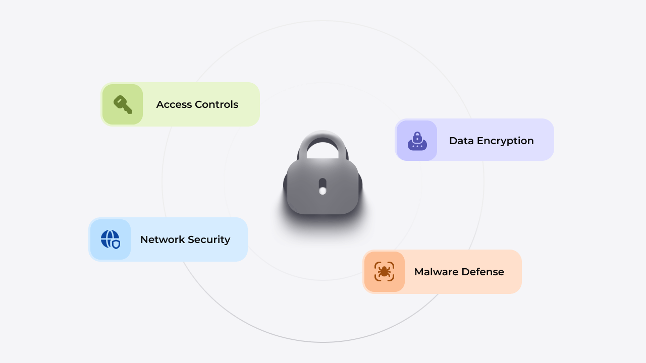 Network Security: Firewalls, intrusion detection systems, and strict monitoring ensure your data is safeguarded at every step.
